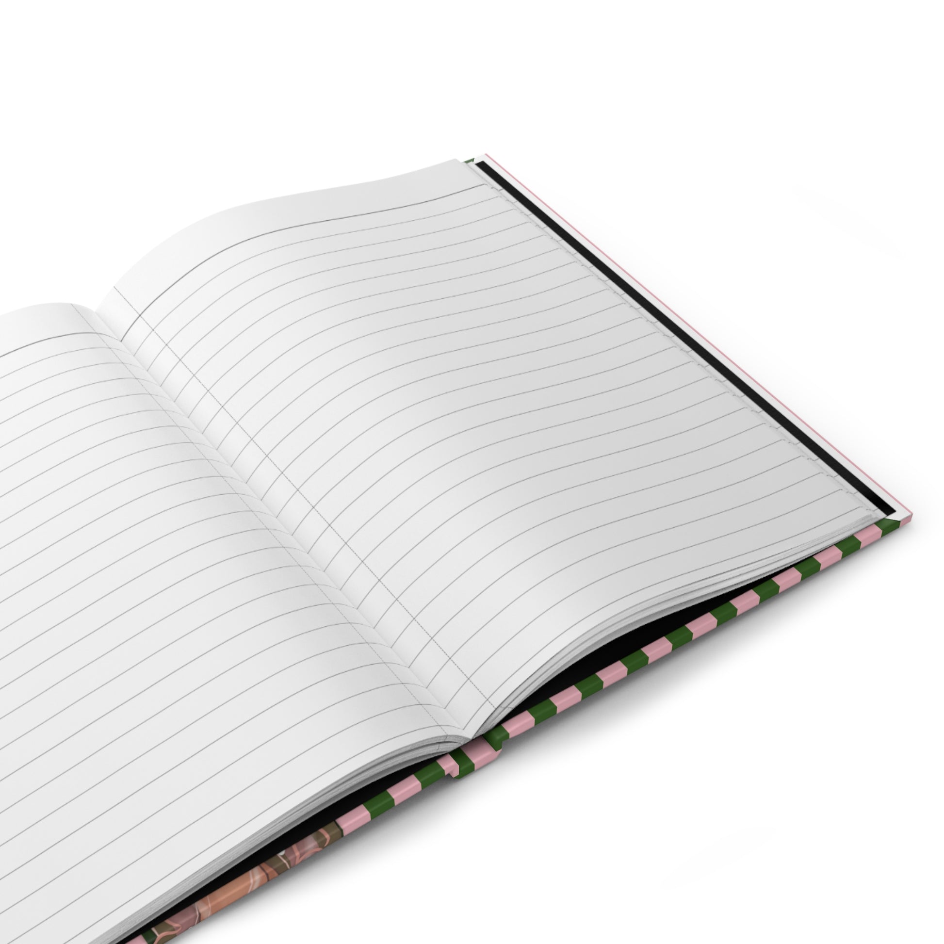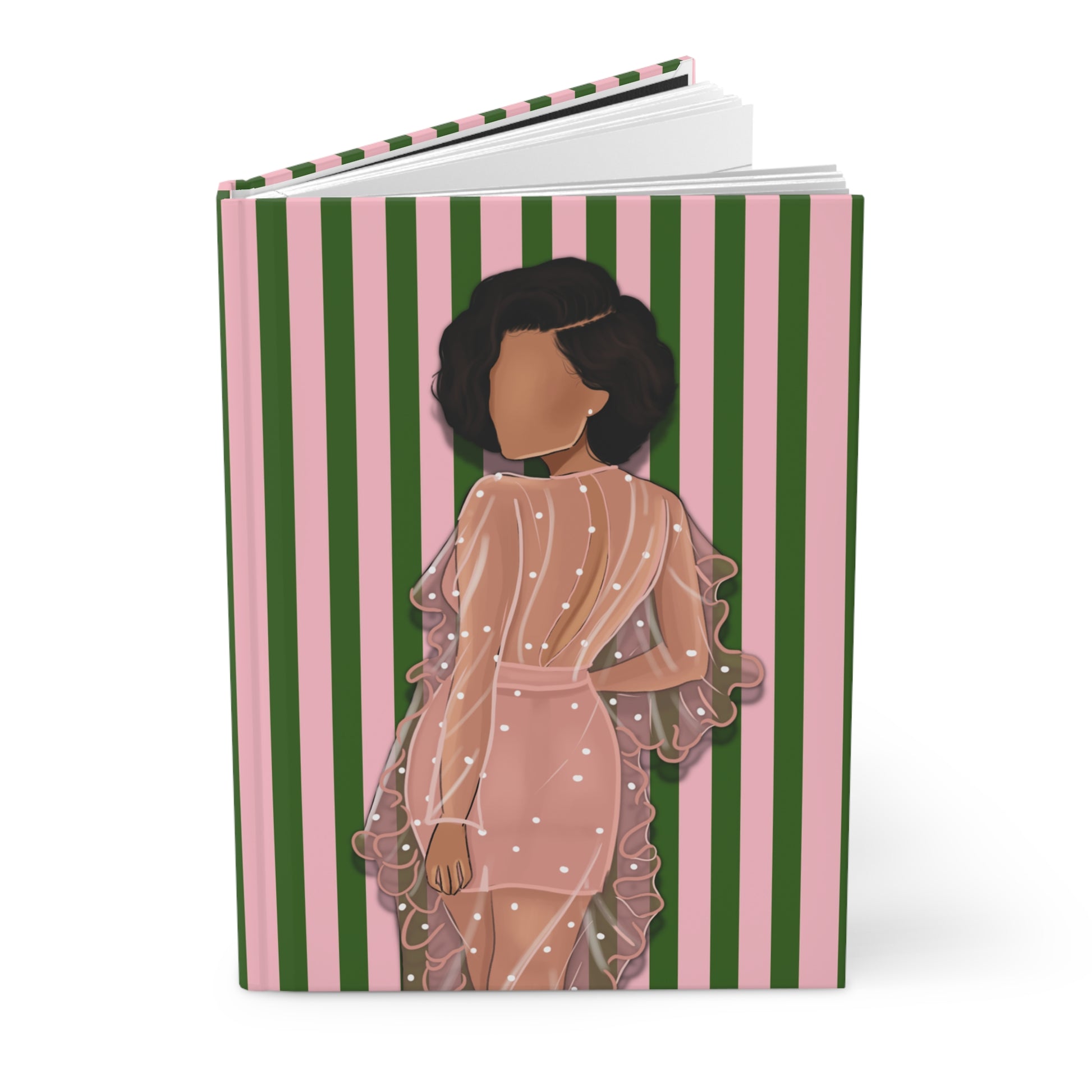 Hold this journal and step into a quiet, intimate scene. Soft pink and green stripes ripple across the matte cover, while a figure in a sheer pink dress, draped with pearls, invites slow afternoons of reflection. The sewn spine lets the book open flat for sketching or long entries. Tear out a page cleanly when you need to share a note or leave a memento. It’s the kind of notebook that sits on a vanity or coffee table and waits for the right moment—a private place for tender thoughts, list-making, and small poems.